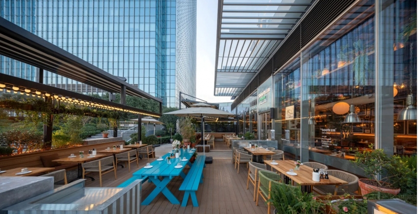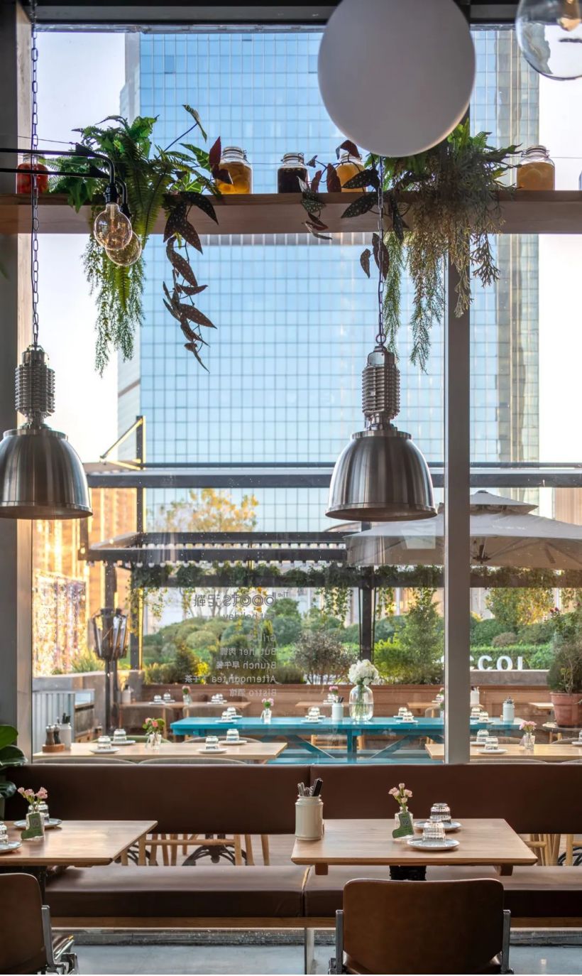 以get holiday為設計理念,是花園,也是農場,一種回歸自然的用餐場景,也是視覺傳播中的標志性記憶。餐廳被四周的綠植圍繞,似一道“透明”的邊界。身臨其境,好似一處親密的烹飪花園。我們期待以平凡、質樸的設計語言來營造出餐廳回歸田野和假日的氛圍感。