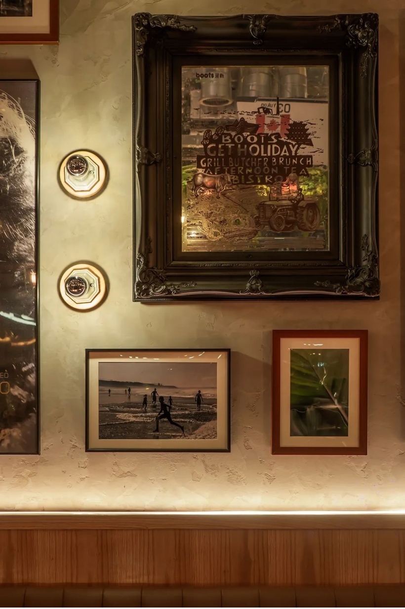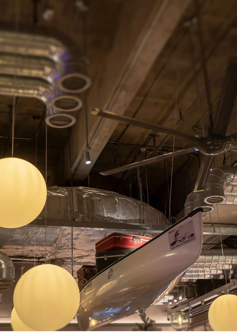 在餐廳空間的正中央的天頂上,吊置著一艘加拿大CLIPPER中古賽艇,創造力的道具,讓空間增添故事性。墻上由設計師收集全球的中古版畫與旅途的照片,與生猛的中古道具組合,傳遞著空間度假的主題??臻g每個角落都包含了設計師的關懷與審美,彰顯擇物的功力。讓泥靴用餐環境,即簡潔復古,又不失去人間煙火氣,通過設計恰到好處的拿捏。小船兩邊懸吊著暖黃色的球燈,仿佛在空中夢游,一切都暗示著泥靴不僅僅是一家餐廳,而是一個飄逸著自由精神的美夢。